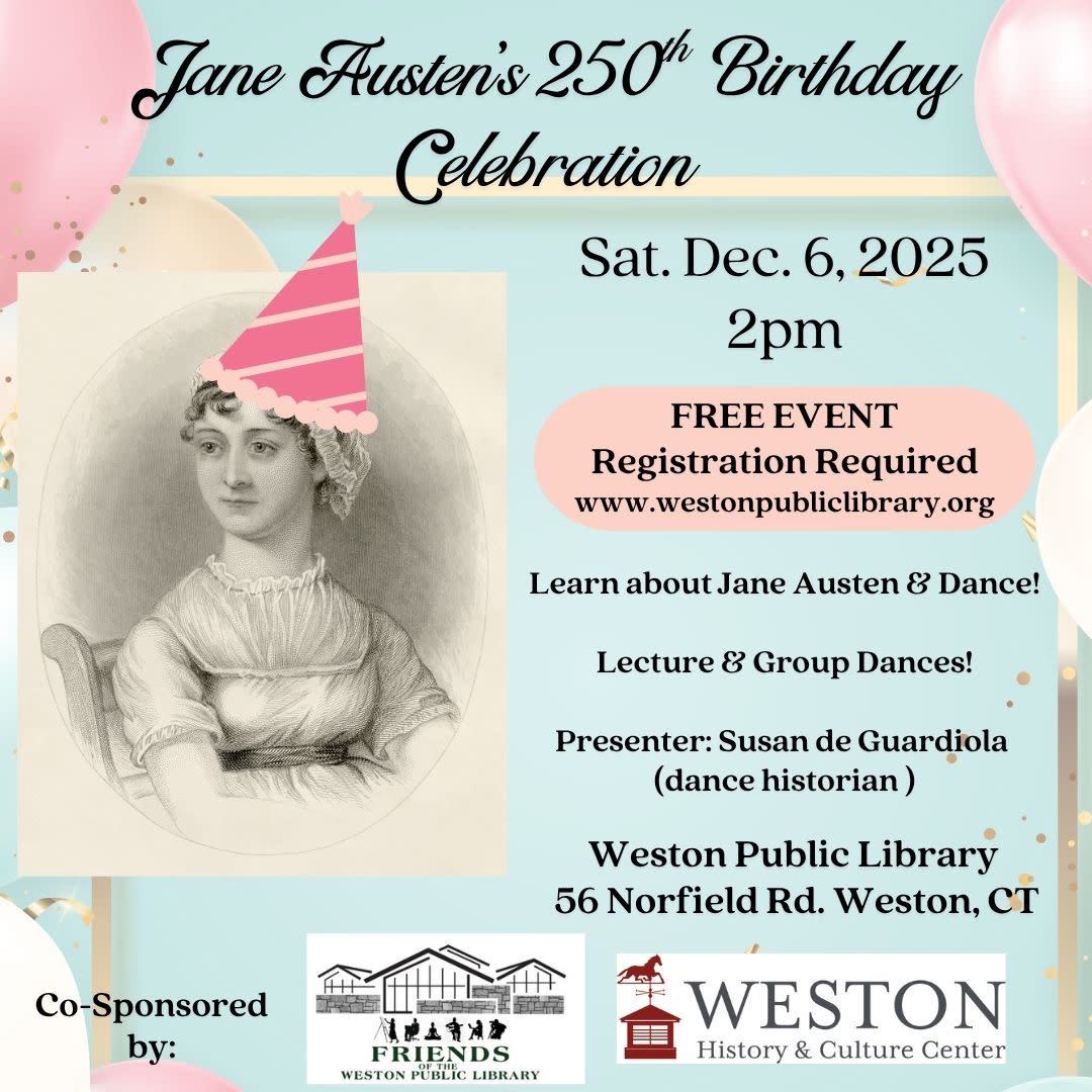 Celebrate Jane Austen’s 250th birthday with the Weston History & Culture Center and the Friends of the Weston Public Library on Saturday, December 6, 2025 at 2pm at the Weston Public Library, 56 Norfield Rd. in Weston, CT. FREE event – Registration Required. Register here: https://westonpl.librarycalendar.com/event/jane-austen-program-4271