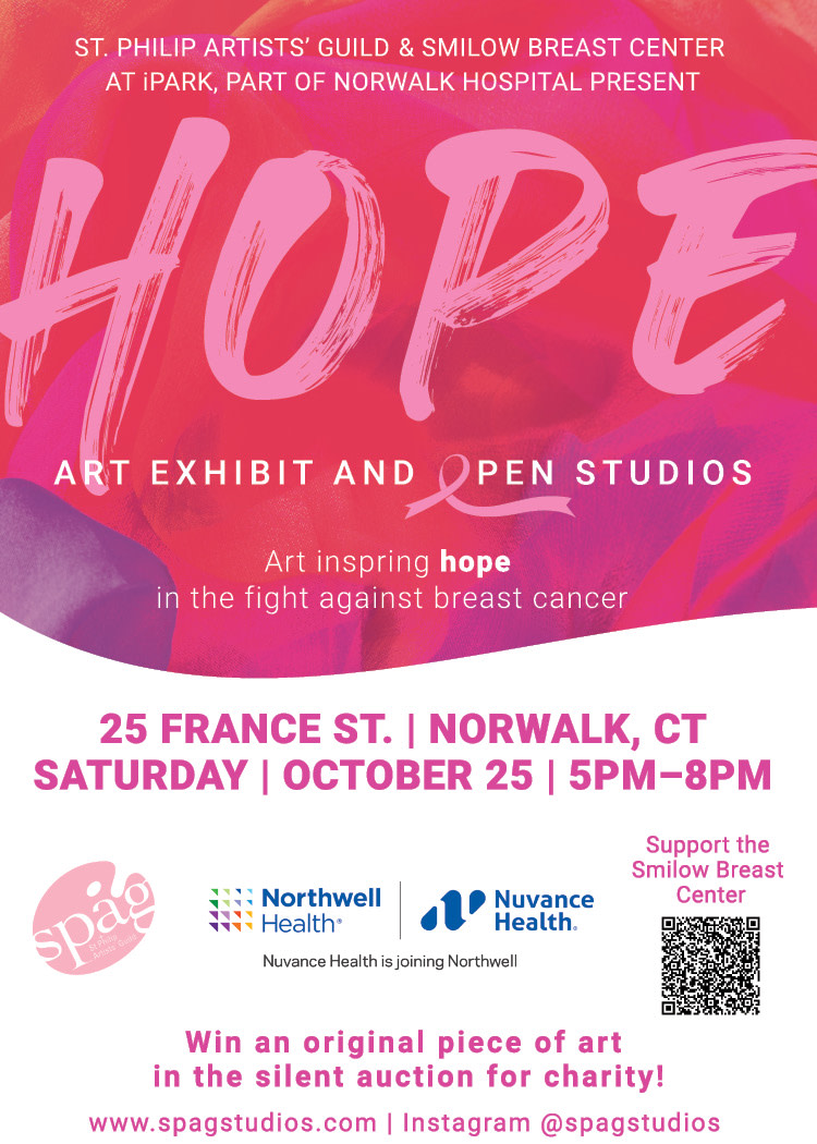 Art inspiring hope in the fight against breast cancer, Exhibition and open studios presented by St. Phillip Artists' Guild Smilow Breast Cancer and iPark, part of Norwalk Hospital.